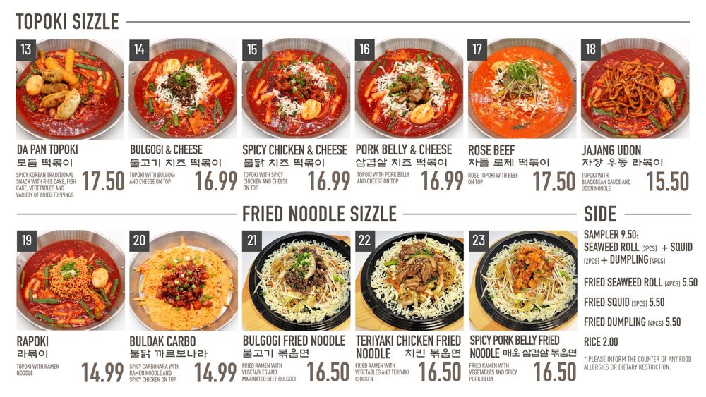 - Topoki Sizzle: A must-try includes the Da Pan Topoki, featuring chewy rice cakes enveloped in a savory spicy sauce, served with crispy squid and delectable fried rolls.